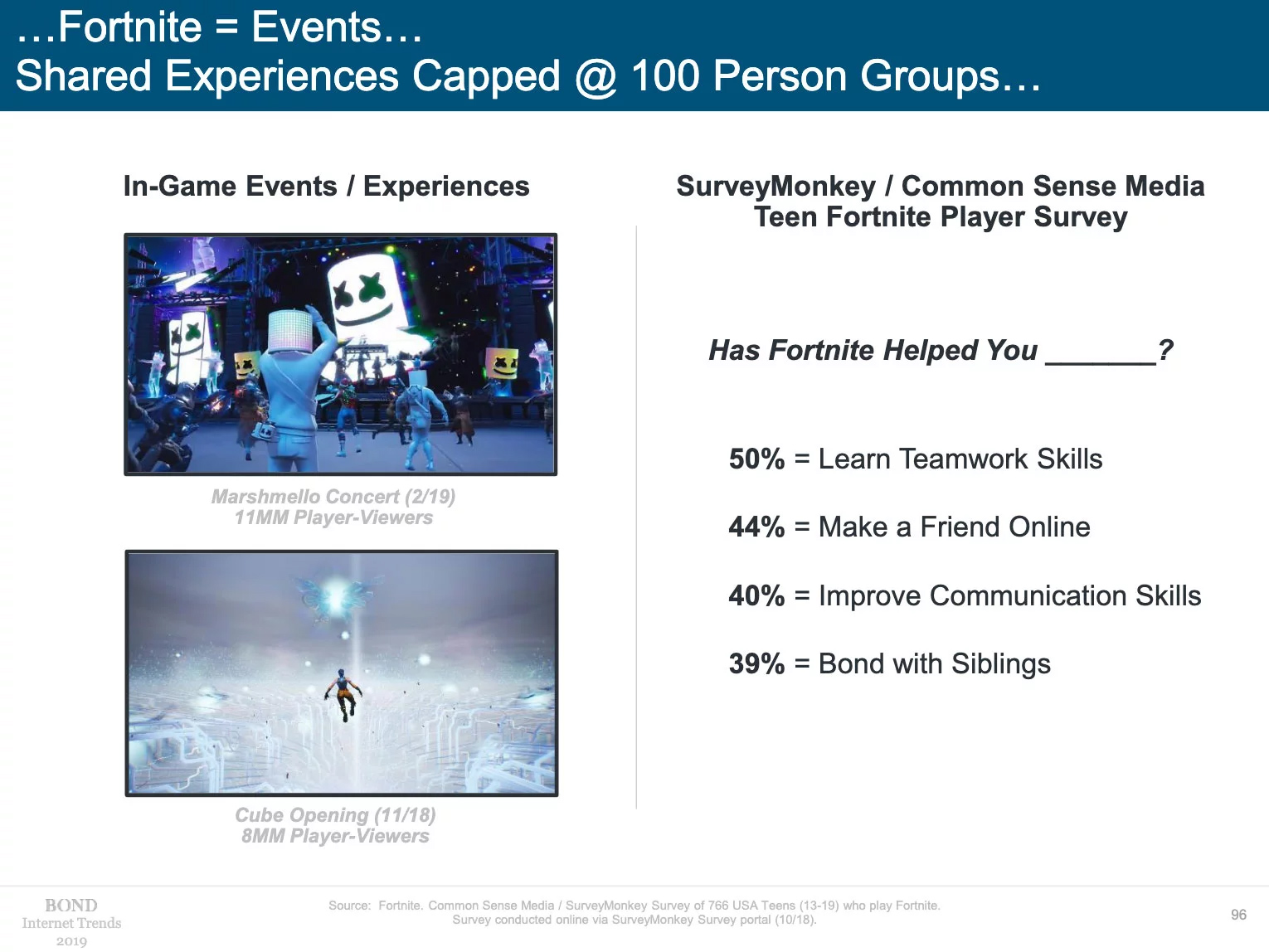 2. Los videojuegos con múltiples jugadores como Fortnite, que se jacta de tener a su vera más de 250 millones de usuarios activos (la mayor parte de los cuales tienen menos de 17 años), presentan cada vez más concomitancias con las redes sociales. ¿El motivo? La celebración de multitudinarios eventos como el concierto de DJ Marshmello en Fortnine, que atrajo a la friolera de 11 millones de personas al célebre videojuego.
