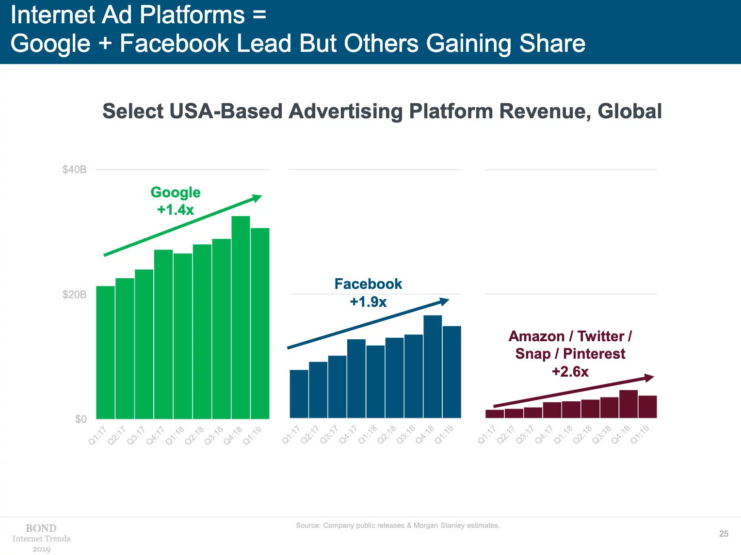 5. Están emergiendo nuevas plataformas como receptáculo de la inversión publicitaria. Amazon, Twitter y Pinterest vieron multiplicado por seis el gasto publicitario atraído a sus respectivas plataformas (de manera colectiva) desde el año 2017. Sin embargo, Google y Facebook (los indiscutibles reyes de la publicidad digital) continúan creciendo a buen ritmo.