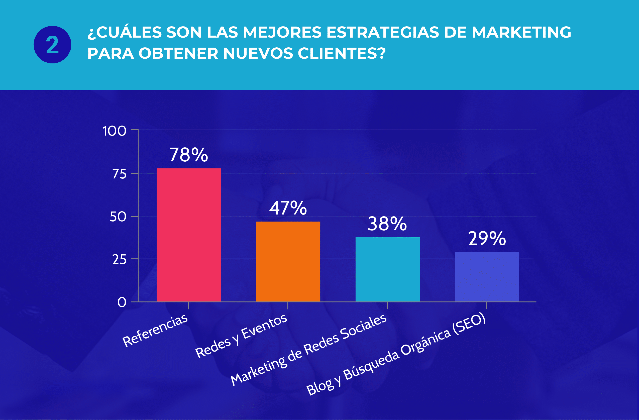 En esta pregunta la mayoría de encuestados estuvieron de acuerdo en su respuesta mayoritaria. Las referencias son percibidas como la mejor estrategia para un plan de marketing. Mencionaron también que han sido un aspecto clave para lograr nuevos negocios, y el 47,7% afirmó que las redes y eventos eran la forma más efectiva para encontrar consumidores.