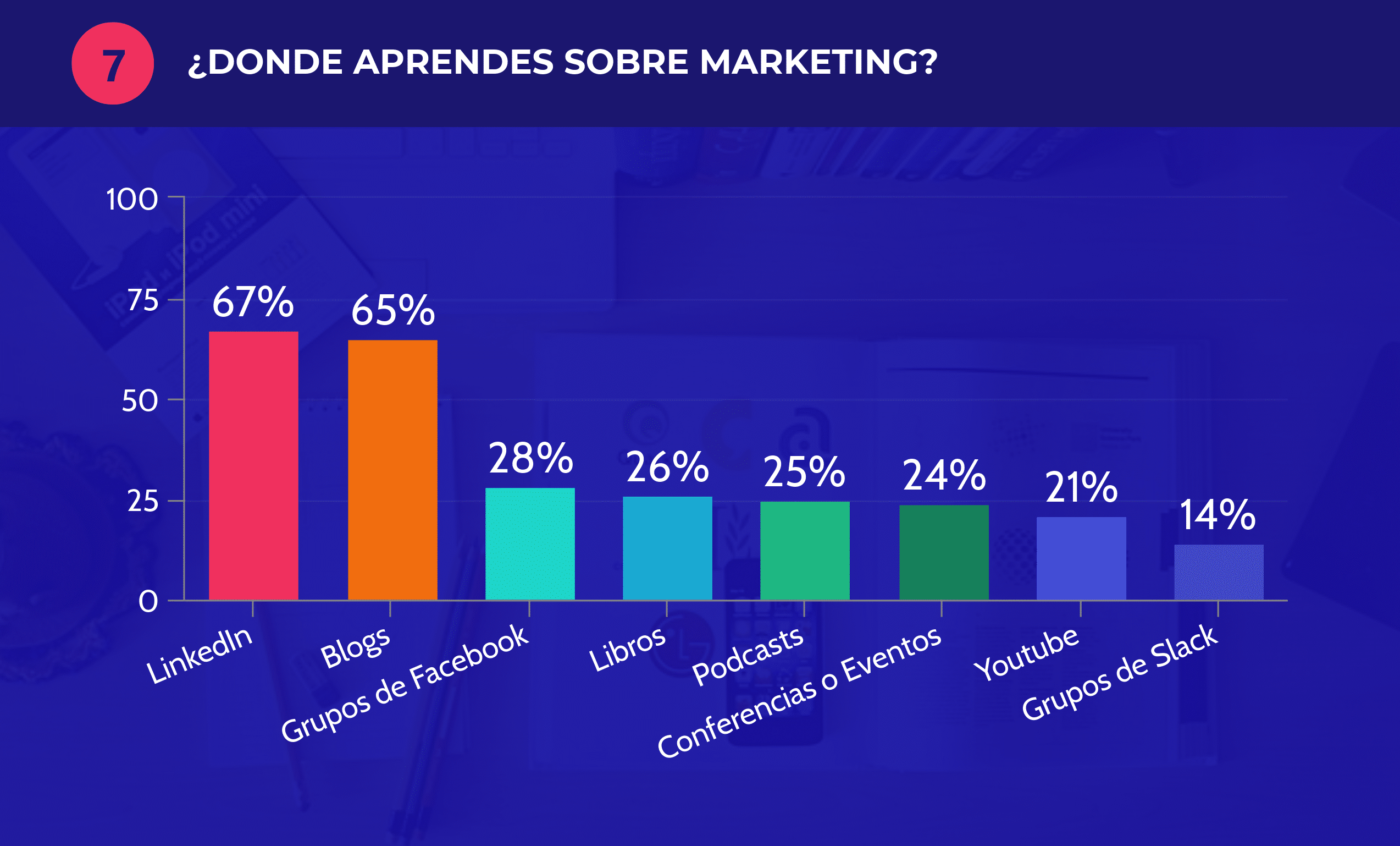 De nuevo volvemos a las redes sociales. Los encuestados tratan de buscar recursos de marketing en la red que califican como prioritaria, LinkedIn. Los blogs son también ampliamente utilizados a la hora de buscar estrategias y aprender nuevos conceptos.