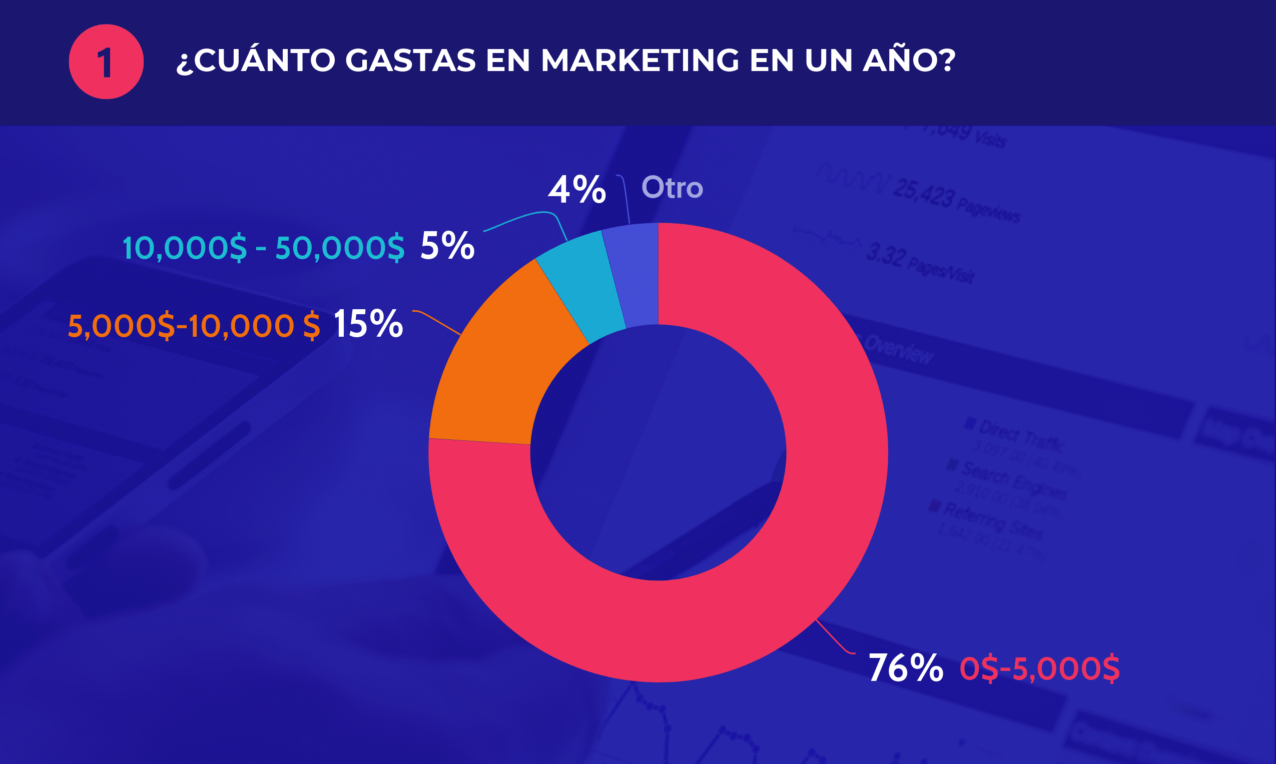 A la primera pregunta de la encuesta, la gran mayoría de los participantes dijeron que gastaron menos de 5.000 dólares al año en marketing. Tan solo el 15,4% invirtió entre 5.000 y 10.000 dólares al año.
