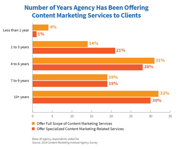 Aproximadamente la mitad de ambos tipos de agencias (tanto aquellas de carácter generalista como las especializadas en content marketing) dice ofrecer servicios de content marketing desde hace siete o más años. De hecho, los servicios de marketing de contenidos comprenden casi el 50% de su negocio.