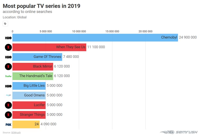 A pesar de que Juego de Tronos es una de las producciones más vistas de la historia, los datos recogidos por SEMrush son sorprendentes. Y es que la media de búsquedas de este título desde enero hasta el pasado mes de junio fue de más de 724.000, alcanzando, durante los meses de emisión, más de 1.800.000 registros.