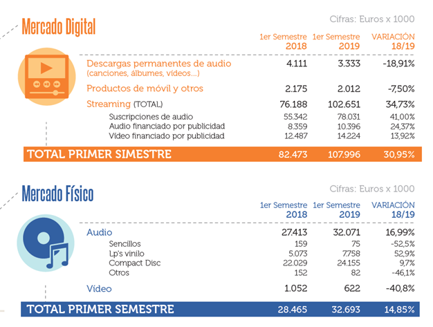 Los ingresos de la música grabada en España han registrado un crecimiento del 26,9% de enero a junio de 2019 con respecto al mismo periodo del año anterior. En cuanto al gasto de los españoles en escuchas online, CDs y vinilos, la cifra asciende a los 140,7 millones de euros, en comparación con los 110,9 millones de euros.