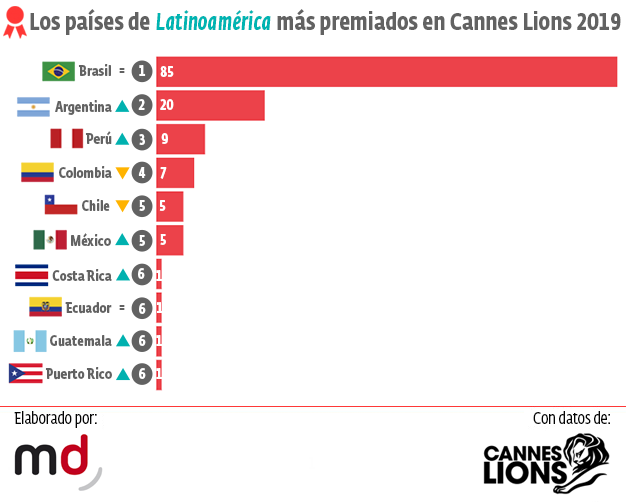 Latinoamérica, que logró sumar ayer 11 leones, ha cerrado el festival con 135 galardones, 43 menos de los logrados en 2018. Por países, Brasil ha liderado el ranking, con 85 premios conseguidos en Cannes Lions 2019, seguido por Argentina (20), Perú (9), Colombia (7) y Chile (5) y México (5).