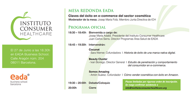 La sede de EADA Business School acogerá el próximo jueves, 27 de junio a las 18:30h, la Mesa redonda “Claves del éxito en e-commerce del sector cosmética”, la quinta realizada en colaboración con el Instituto Consumer Healthcare (ICH), una asociación profesional sin ánimo de lucro cuya misión es ayudar a desarrollar este mercado en España.