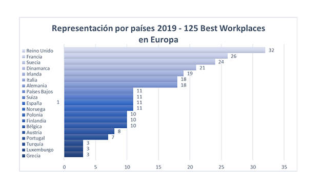 Por cuarto año consecutivo, Reino Unido vuelve a ser el país con mayor número de empresas representadas en el Ranking, con 32 británicas reconocidas; le sigue Francia con 26 empresas; y Suecia, que suma 24 compañías premiadas. Por su parte, España se sitúa en el noveno lugar con 11 compañías representadas en el Ranking de Mejores Empresas para Trabajar en Europa. Todas estas compañías pertenecen a la categoría de multinacionales, ocupando siete de ellas el “Top 10” de Europa: la compañía de Recursos Humanos, The Addeco Group, se sitúa en el segundo lugar del Ranking; seguida de la biofarmacéutica AbbVie, en cuarta posición; la tecnológica Cisco Systems, en quinto lugar; la empresa de alimentación MARS, sexta en el Ranking; la compañía aseguradora Admiral Seguros, en séptimo lugar; la empresa de servicios financieros AMERICAN EXPRESS, en octava posición; y la tecnológica SAS Institute, ocupando el noveno puesto.
