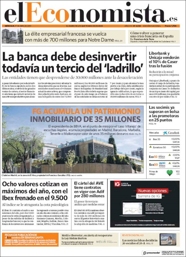 EL ECONOMISTA: “La banca debe desinvertir todavía un tercio del ‘ladrillo’; “FG acumula un patrimonio inmobiliario de 35 millones”; “Liberbank y Unicaja venderán el 10% de Caser tras la fusión”; “Ocho valores cotizan en máximos del año, con el Ibex frenado en el 9.500”; “Las socimis ya superan en bolsa a las promotoras en 25 puntos”; “El cártel del AVE tiene contratos en vigor con Adif por 280 millones”.
