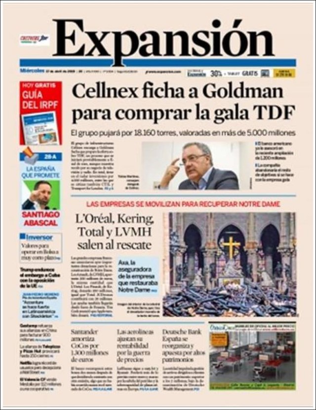 EXPANSIÓN: “Cellnex ficha a Goldman para comprar la gala TDF”; “L’Oreal, Kering, Total y LVMH salen al rescate”.