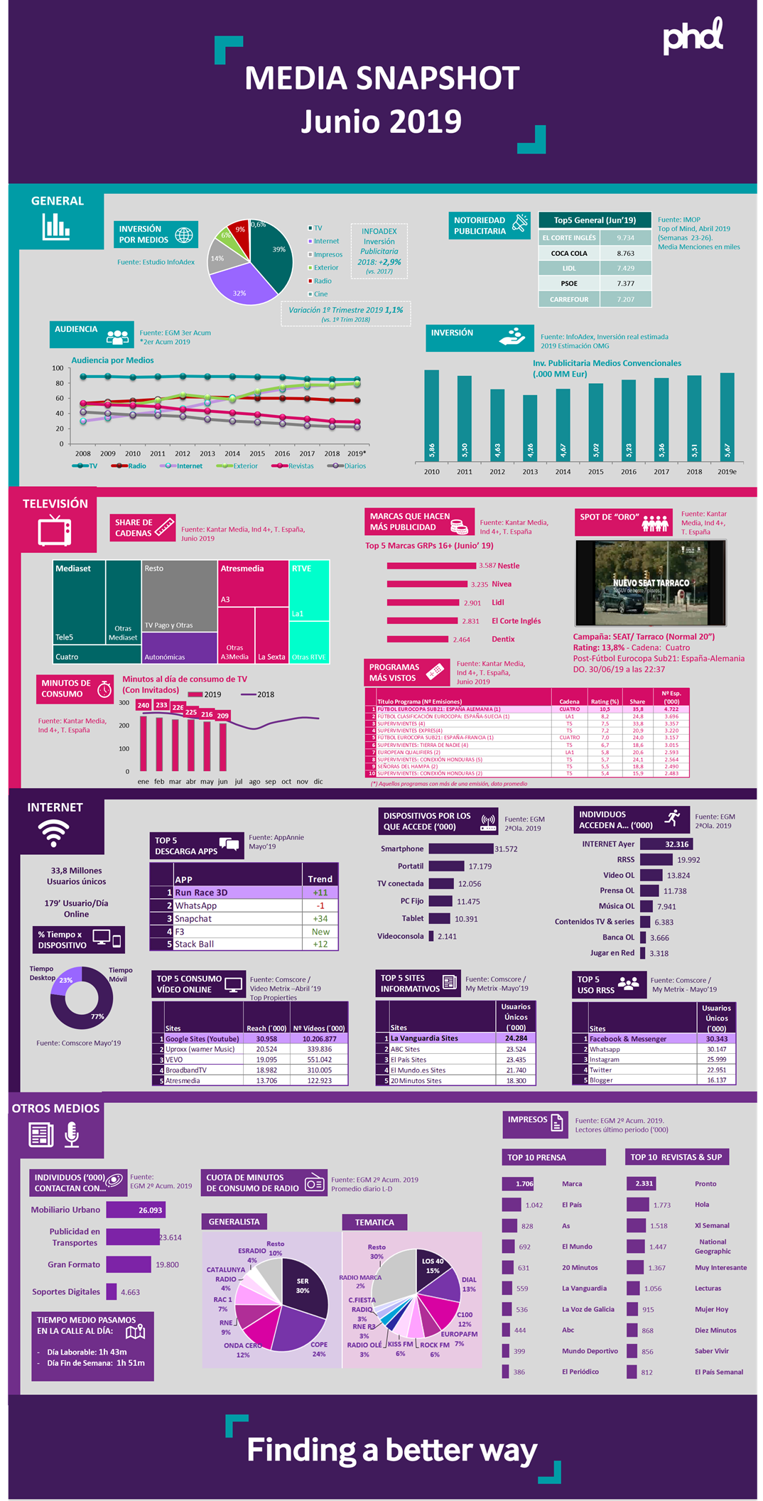 El Corte Inglés, Coca-Cola y Lidl se coronan como los anunciantes con mayor notoriedad publicitaria en el mes de junio. Así lo refleja PHD en su Media Snapshot correspondiente a junio de 2019 en el que, además, desgrana el comportamiento de los principales medios.