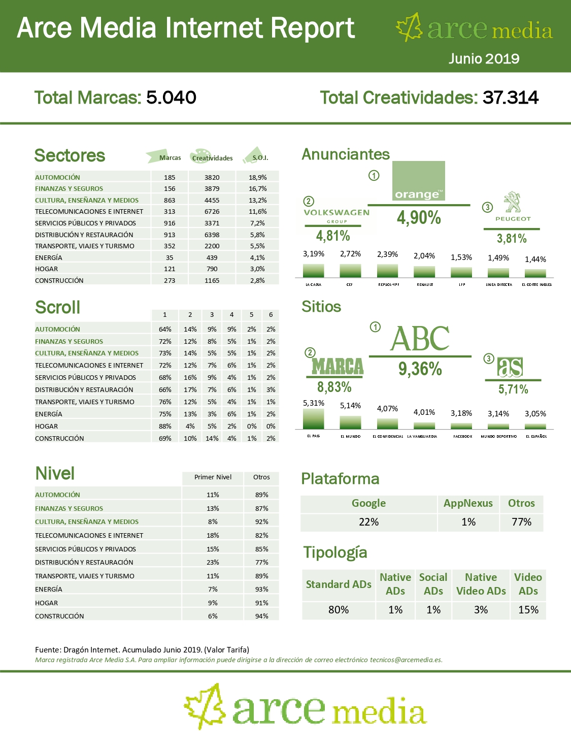 Arce Media ha dado a conocer el análisis del medio internet correspondientes al mes de junio de 2019 en el que se realiza un seguimiento de la actividad publicitaria online.