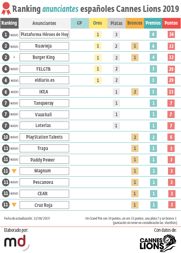 Siguen a la Plataforma Héroes de Hoy como anunciantes más galardonados (con la intervención de agencias españolas) en Cannes Lions 2019 Ruavieja (1 oro, 2 platas, 1 bronce y 32 puntos), Burger King (1 oro, 2 platas, 1 bronce y 32 puntos), y FELGTB y eldiario.es (1 oro, 2 platas y 29 puntos). Hace un año Burger King se encaramó también a la segunda plaza del podio como anunciante más galardonado.