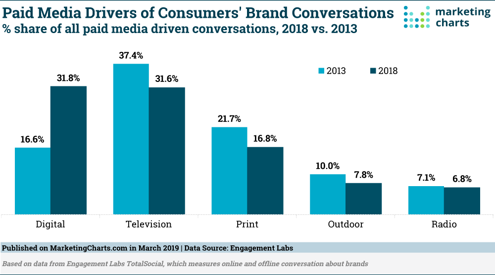 En 2013 la televisión era aún el medio pagado que generaba más conversaciones marketeras entre los consumidores. El 37,4% de las conversaciones emanadas de medios pagados eran engullidas por la pequeña pantalla. Cinco años después la televisión ha sido despojada de la corona a la hora de generar conversaciones en torno a las marcas y se tiene que conformar con un porcentaje del 31,6%.