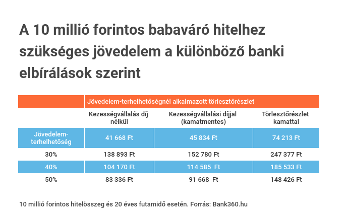 A Bank360.hu babaváró hitel kalkulátorával számolva a kamatmentes hitel törlesztőrészlete csak 45 834 forint, azaz majdnem 30 ezer forinttal alacsonyabb a piaci kamatozással számolt forgatókönyvhöz képest. A fentiek alapján tehát azon bankoknál, amelyek a kamatmentes törlesztőrészletet veszik figyelembe a jövedelem-terhelhetőség vizsgálatánál, ott: