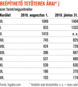 E „telkek” 20-30 méter magasan vannak. A tetőtéri lakáskínálat a II., III. és XVI. kerületben a legnagyobb, az V. kerületben a nyár közepén nem volt eladó beépíthető tetőtér, a VI. kerületben csak egy, a VII. kerületben pedig kettő.