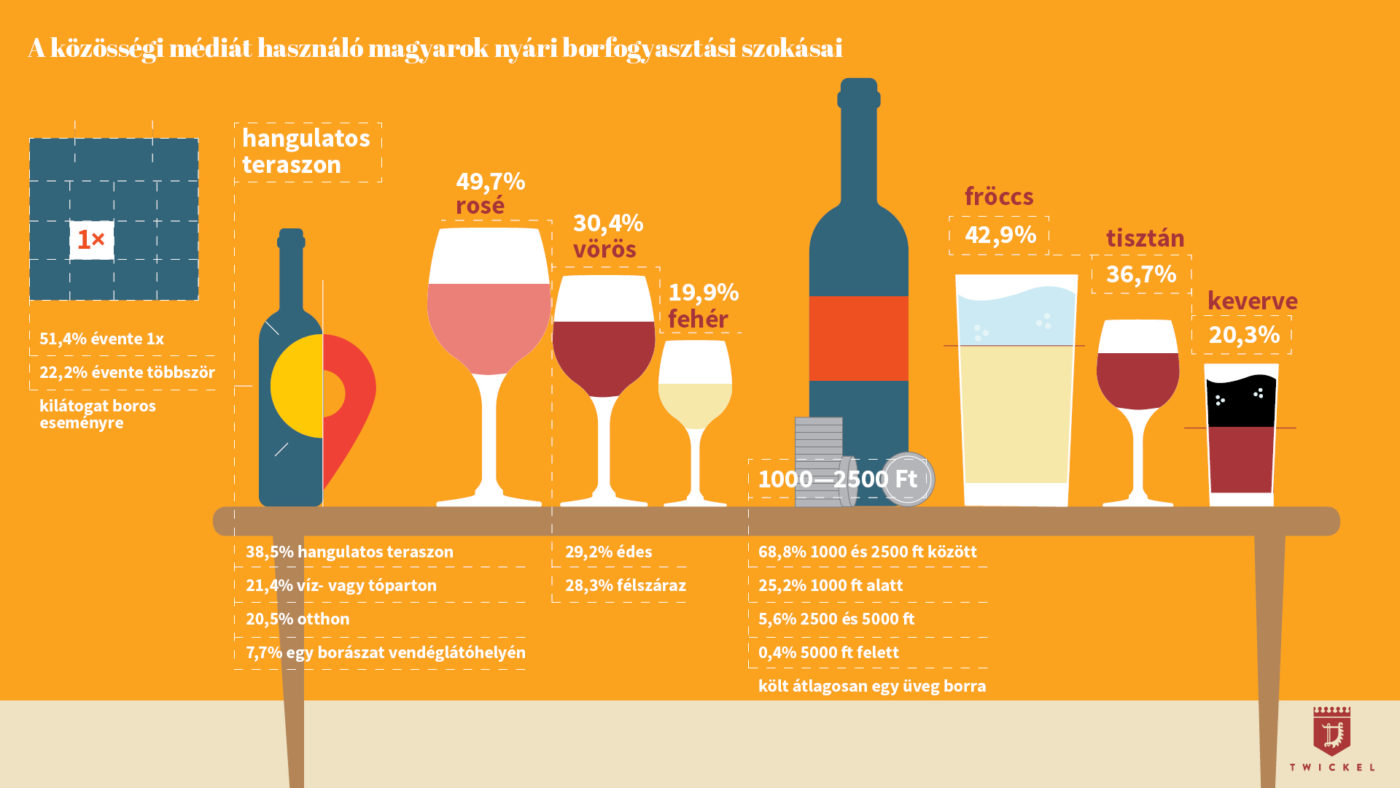 A nyári időszakban legszívesebben hangulatos teraszon rosét isznak a közösségi média használók, ilyenkor inkább édes vagy félszáraz ízt választanak, és egy-egy nyári beszélgetés során átlagosan 3-4 deci bort fogyasztanak. A többség a fröccs mellett teszi le a voksát: a legnépszerűbb a nagyfröccs és a hosszúlépés, de bor alapú koktélokat csak minden ötödik ember választ. A válaszadók több mint kétharmada 1000 és 2500 forint között költ átlagosan egy üveg borra – többek között ezek derülnek ki a Twickel Szőlőbirtok nyári borfogyasztási szokásokat vizsgáló online kutatásából.