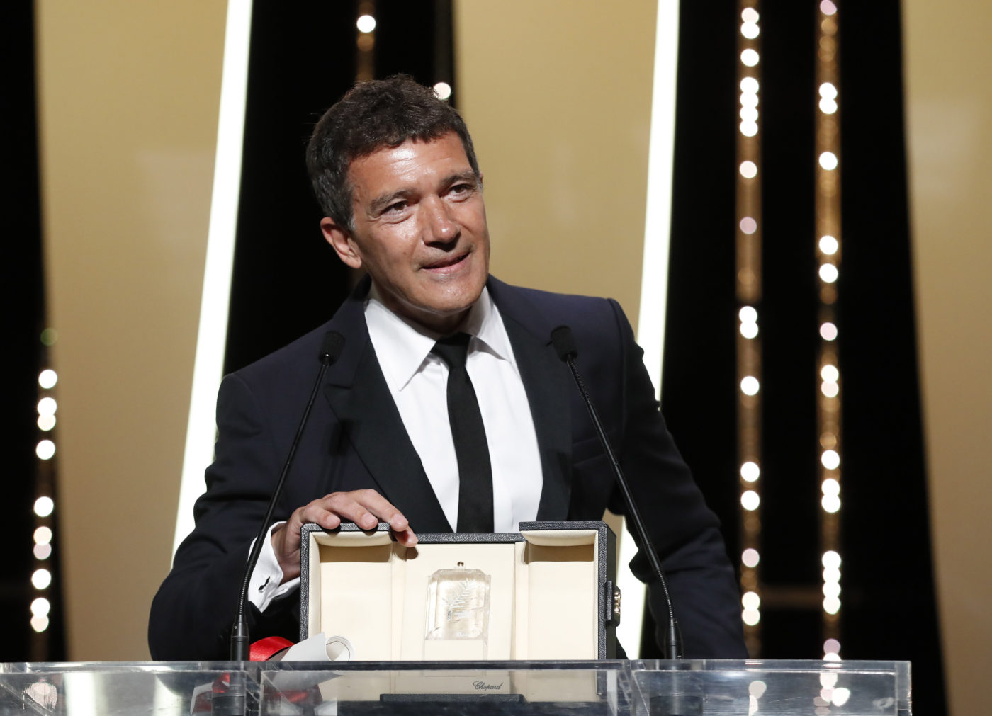 Antonio Banderas spanyol színész beszél, miután átvette a legjobb férfi főszereplőnek járó Arany Pálmát