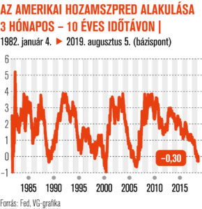Az Egyesült Államokban jobb a helyzet, ott még nem mutatkoztak a negatív hozamok, még a legrövidebb, egy-két hónapos időtávon is 2 százalék felett áll a mutató. Ám a tízéves papír a hét elején már csak 1,63 százalékon forgott, ami csaknem hároméves mélypont. A tengerentúlon általános az a jelenség, amely az euróövezetben nem: az inverz hozamgörbe. A három hónapostól tízévesig terjedő időtávon bő két és fél hónapja negatív a szpred.