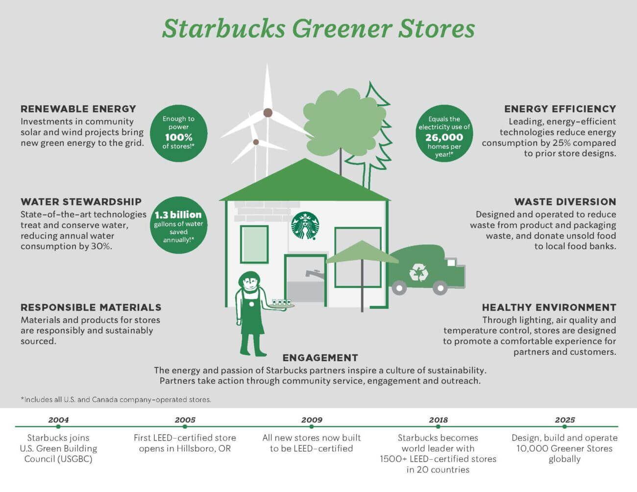 Anche Starbucks è un buon esempio di brand che sfruttano i punti vendita per comunicare la propria cultura di sostenibilità e rispetto dell’ambiente attraverso il ricorso a energie rinnovabili, come quella solare ed eolica, con degli store ideati proprio per ridurre gli sprechi.