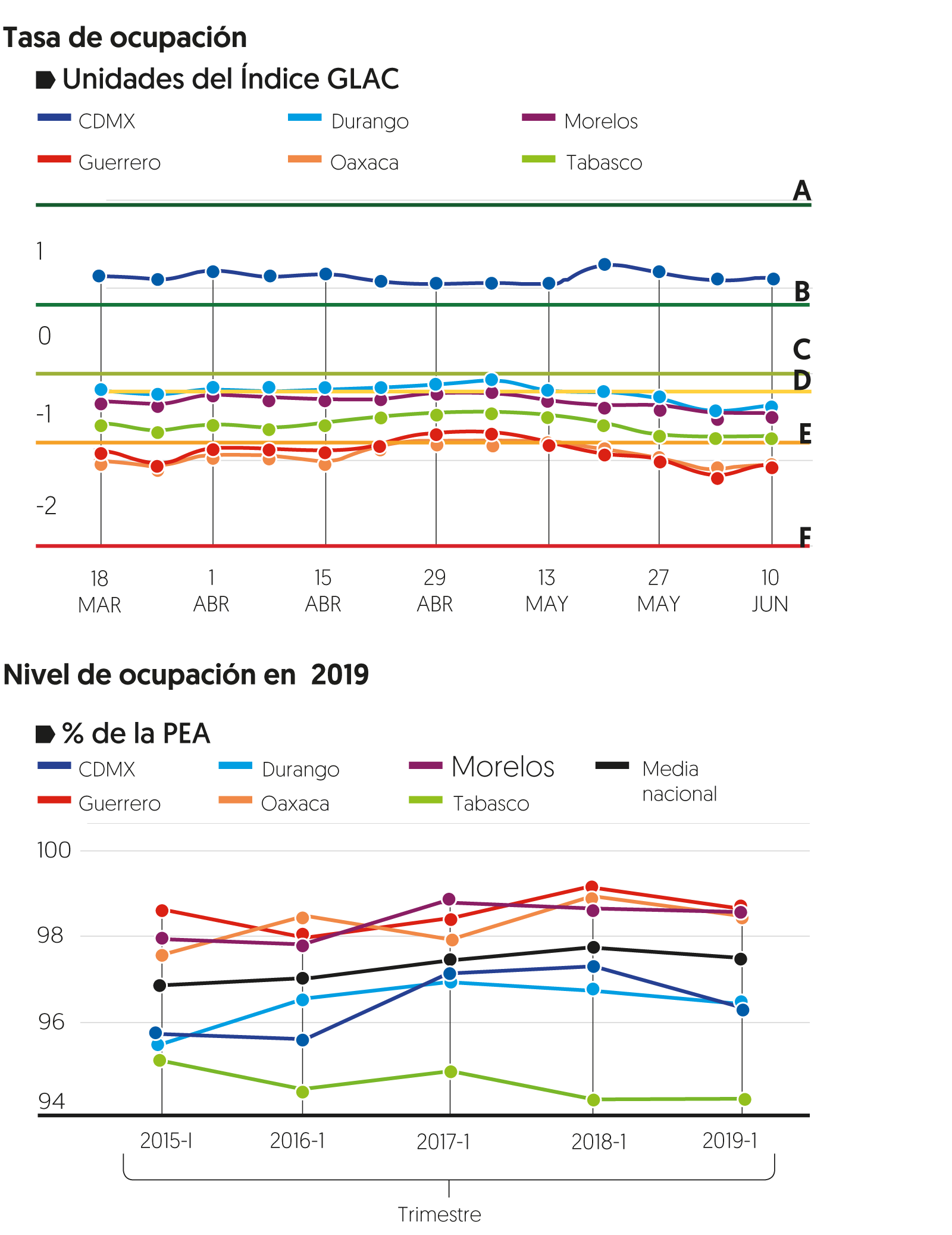 A partir de 2015, la generación de empleos y en consecuencia, el nivel de ocupación en el país, ha mantenido un comportamiento variable; Guerrero, Morelos y Oaxaca destacaron por ser las entidades con mayor crecimiento y valores superiores a la media nacional, mientras que la Ciudad de México, Durango y Tabasco se han encontrado por debajo de la media y con una tendencia descendente.