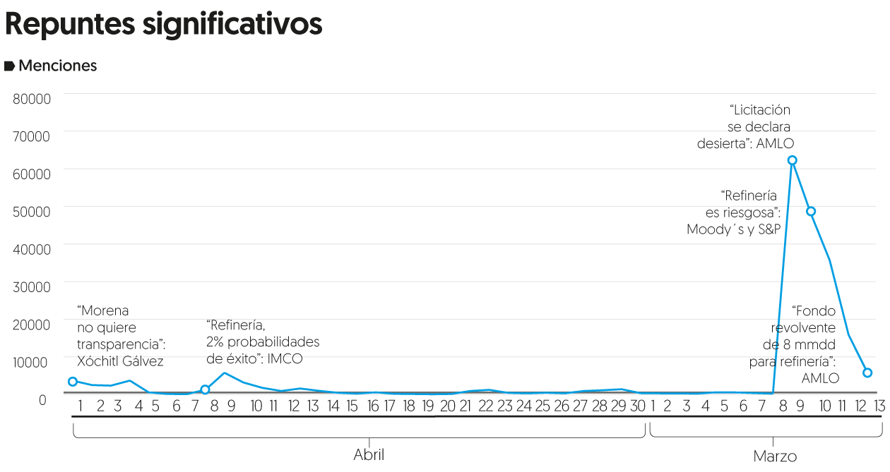 8 de abril, con cinco mil 806 alusiones: portales de noticias y usuarios de redes sociales difundieron la propuesta realizada por el Instituto Mexicano de la Competitividad (IMCO) de “cancelar” la construcción de la refinería debido a que tenía solo “2 por ciento de probabilidades de éxito”.