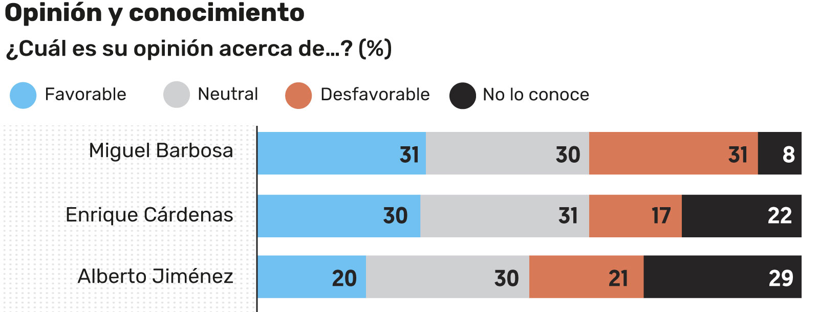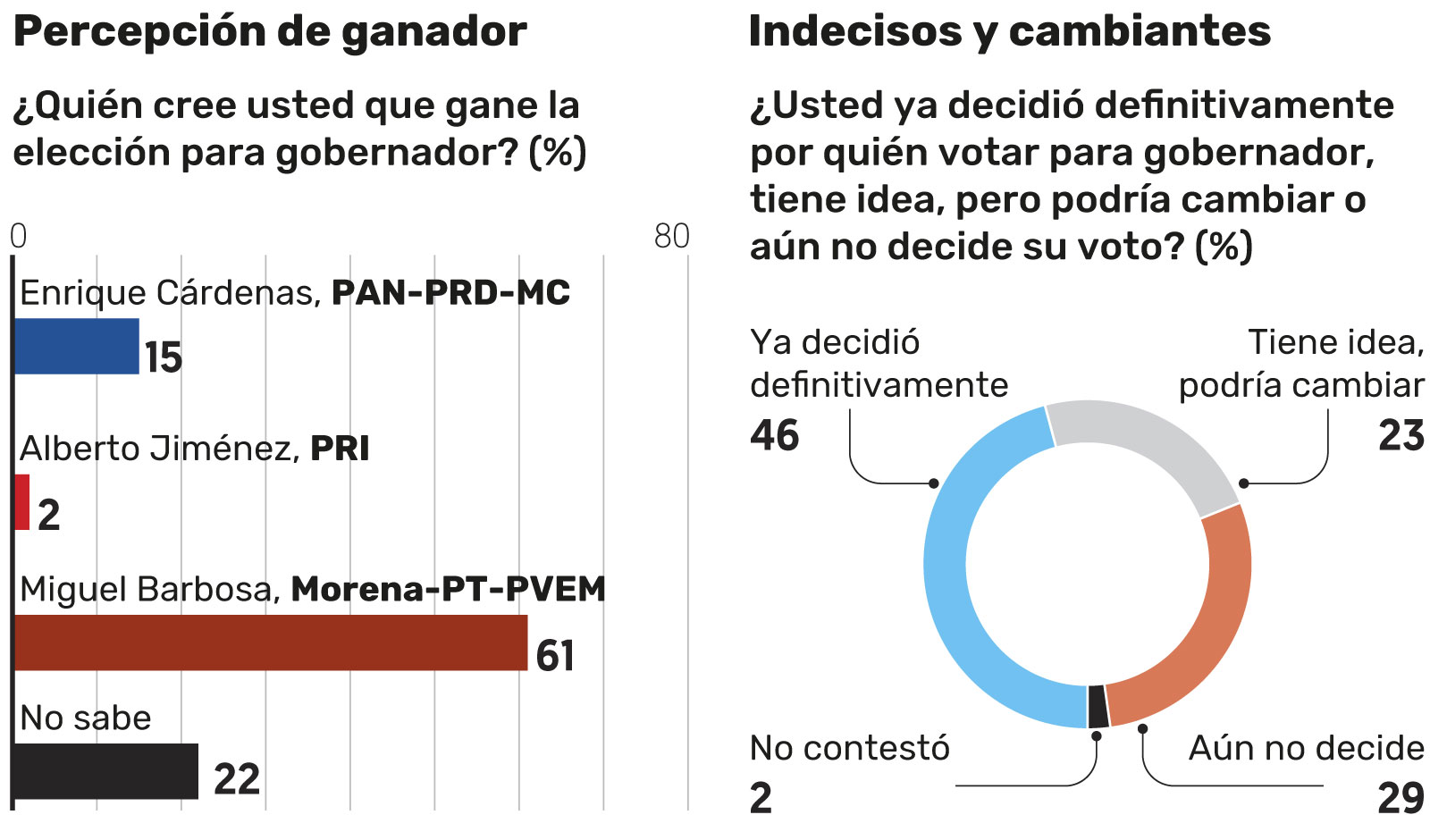 Una encuesta de El Financiero realizada en Puebla revela que Miguel Barbosa, candidato a gobernador por la alianza Morena-PT-PVEM, cuenta con el 54 por ciento de las preferencias, 16 puntos por delante de Enrique Cárdenas, candidato de la alianza PAN-PRD-MC, quien obtiene 38 por ciento. En un rezagado tercer lugar aparece Alberto Jiménez, candidato del PRI, con ocho por ciento. Estos son porcentajes efectivos de preferencia sin considerar 29 por ciento de entrevistados indefinidos.