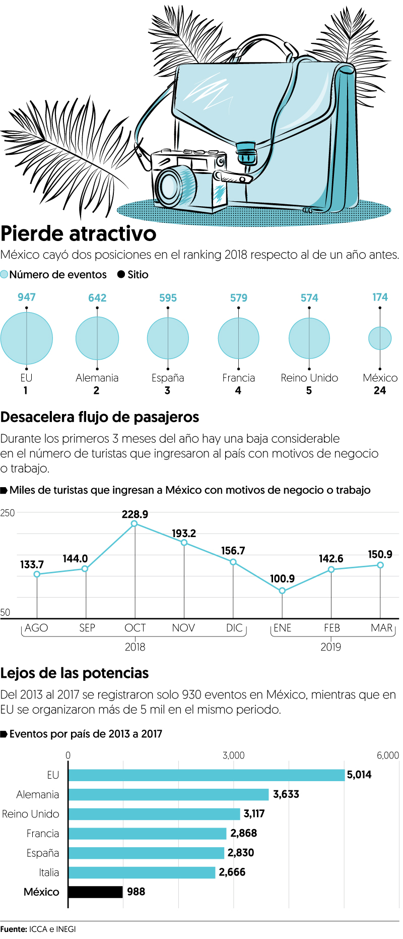 A pesar de la importancia de esta actividad, en 2018 México solo registró ante la Asociación Internacional de Congresos y Convenciones (ICCA, por sus siglas en inglés) 174 eventos –en 2017 fueron 198– situación que ocasionó la caída de dos peldaños en el ranking de la institución, por lo que el país se ubica en la vigésimo cuarta posición.
