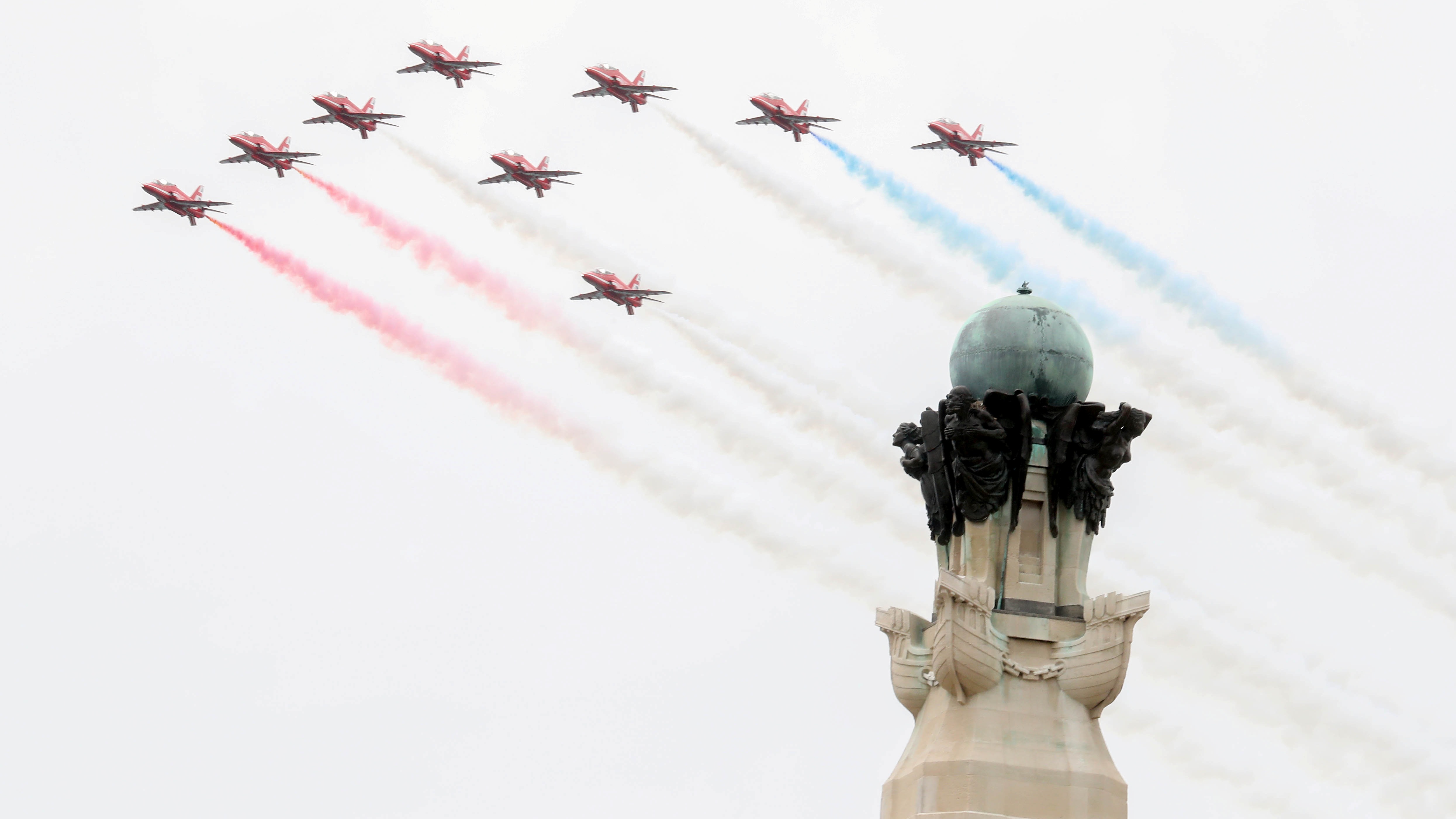 El homenaje culminó con un desfile de aviones antiguos y nuevos que tiñeron el cielo azul, blanco y rojo.