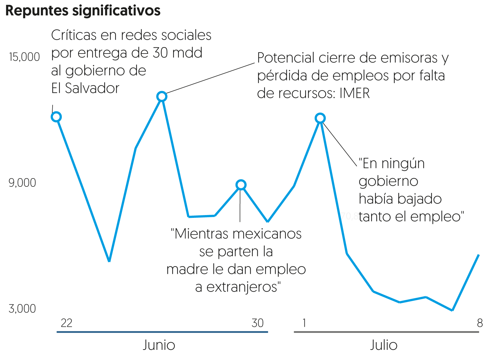 26 de junio con 13 mil 203 referencias: fue el día que acumuló mayor número de menciones durante el periodo analizado. Usuarios de redes sociales reaccionaron y comentaron sobre la potencial desaparición de programas y cierre de emisoras de radio pertenecientes a la plantilla del Instituto Mexicano de la Radio (IMER) por falta de recursos económicos. Usuarios de Internet comentaron que se estaba “desmantelando” la voz de México.