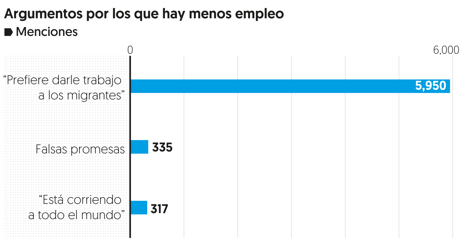 El más destacado con 5 mil 950 menciones fue que Andrés Manuel López Obrador “prefiere” dar empleo a los migrantes y no “a los mexicanos”. En foros de Internet se criticó que el Presidente fuera “candil de la calle y oscuridad de la casa”.