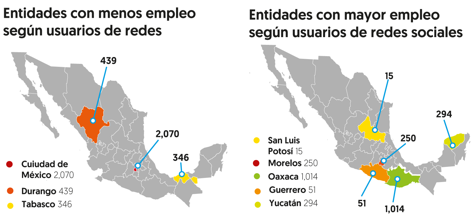 La entidad más mencionada en la discusión sobre el aumento del desempleo fue la Ciudad de México con 2 mil 070 referencias. Usuarios de Twitter aludieron a la Encuesta Nacional de Ocupación y Empleo (ENOE) en el que se ubica a la entidad con uno de los mayores porcentajes de desempleo a nivel nacional con 4.7 por ciento. Se comentó que adicional a esto, la ciudad vivía su peor “crisis de seguridad” y los hospitales no tenían insumos.