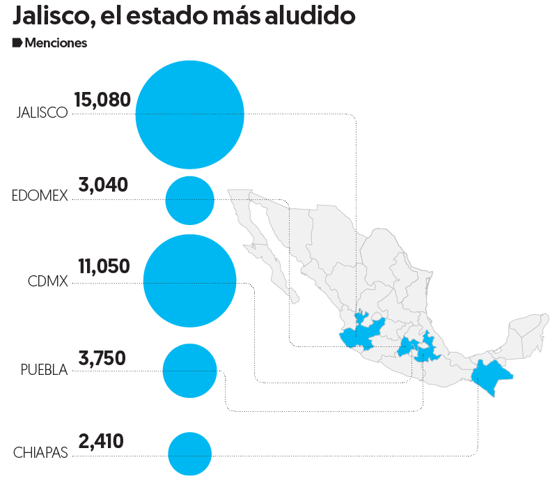 Las entidades con mayor número de referencias fueron Jalisco, con 15 mil 080; Ciudad de México, con 11 mil 50, y Puebla, con tres mil 750.
