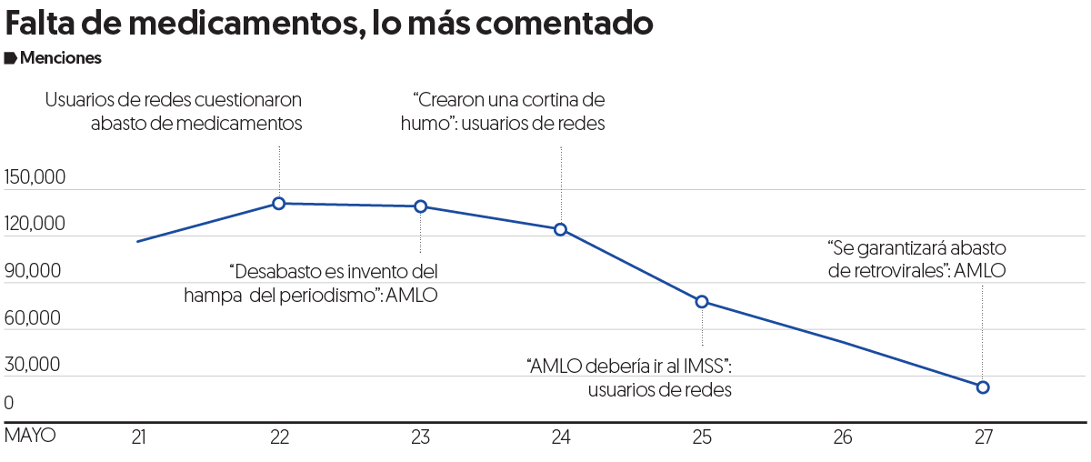 El 22 de mayo fue el día con mayor número de menciones, 141 mil 140, derivado de los cuestionamientos realizados por usuarios de redes sociales y portales de noticias digitales por el abasto de medicamentos.