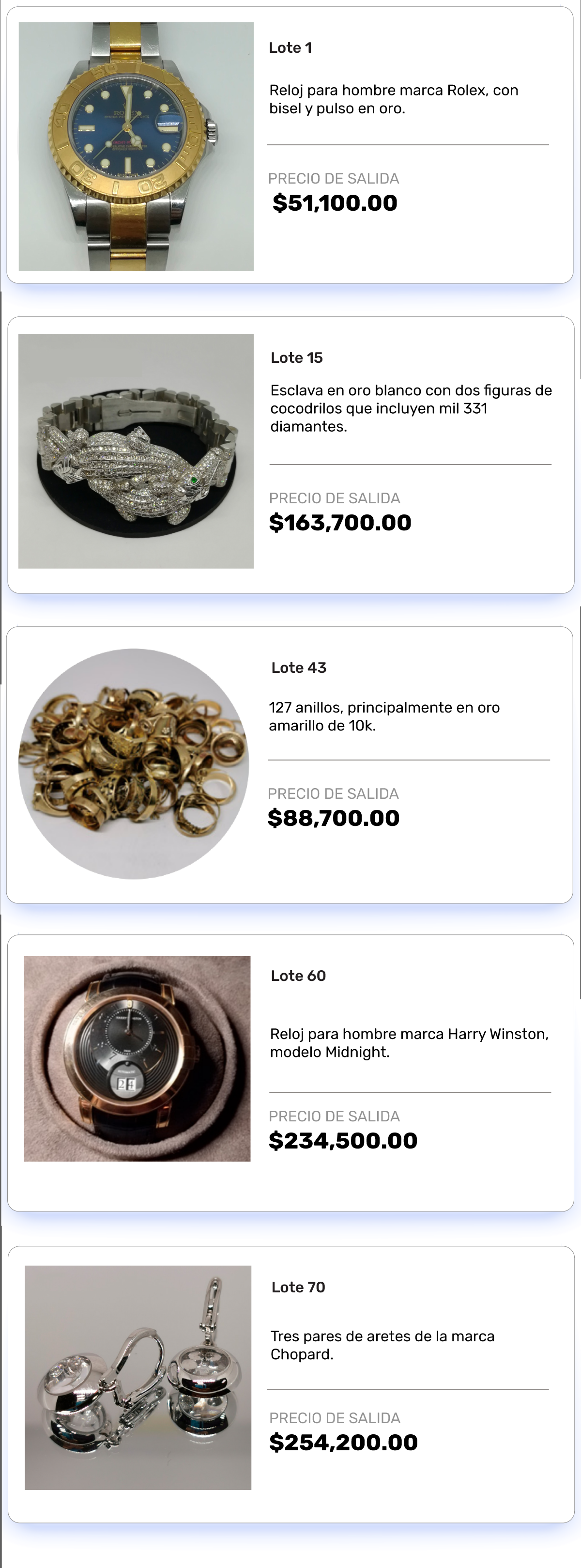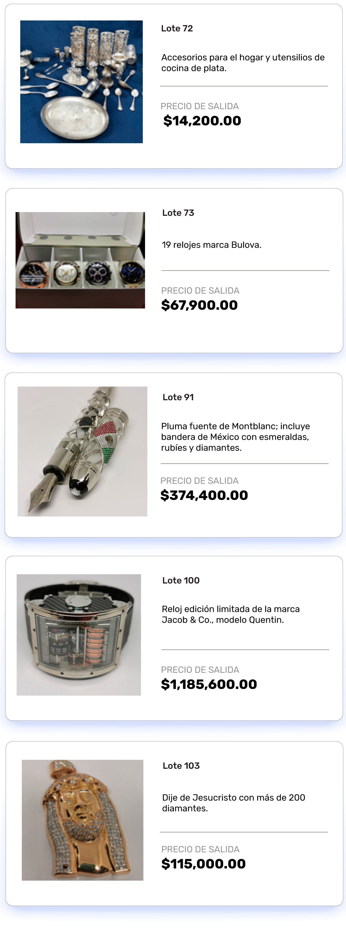 La subasta de joyas que organiza el Gobierno federal está a menos de dos semanas de llevarse a cabo en Los Pinos y los asistentes pueden esperar relojes de lujo, oro, plata, esmeraldas, rubíes, diamantes, entre muchas otras cosas.