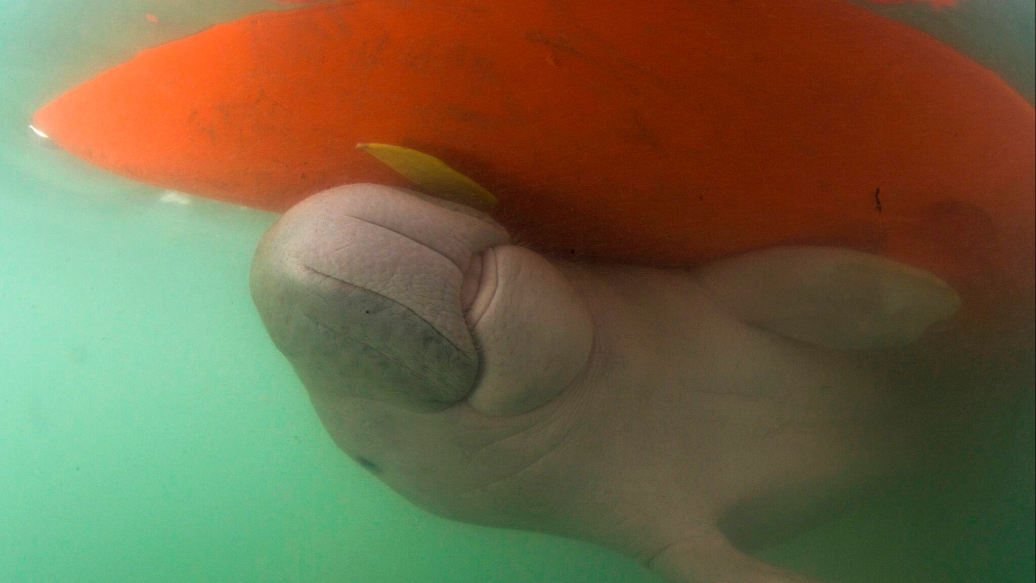 Una cría de dugongo se encariña con sus cuidadores tailandeses