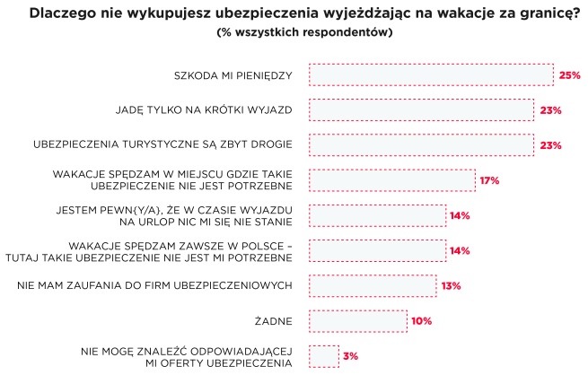 Najczęściej wybierane powody niewykupywania ubezpieczenia turystycznego związane są m.in. z kwestią finansową. Polacy uważają, że ubezpieczenia są zbyt drogie i szkoda im na nie pieniędzy. Niechęć do ubezpieczeń podróżnych wynika również często z krótkiego okresu trwania zagranicznego wypoczynku.