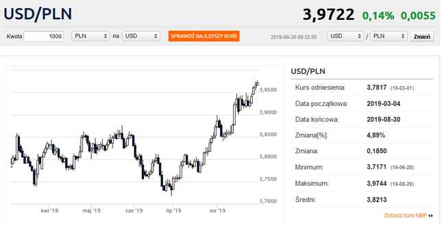 3,9722 zł a jednego dolara. Po raz ostatni amerykańska waluta byłą ta droga w