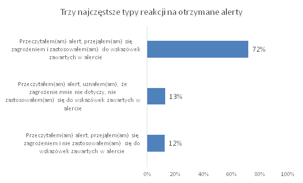 Zdecydowana większość respondentów przyznaje, że czyta alerty i stosuje się do zapisanych w nich zaleceń. Częściej robią to kobiety (80 proc. kobiet i 64 proc. mężczyzn), najrzadziej osoby najmłodsze, do 24. roku życia. Tylko 57 proc. badanych z najmłodszej grupy stosuje się do zaleceń.