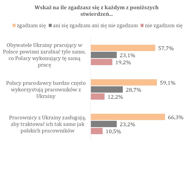 Ponad 57 proc. badanych zgadza się, że obywatele Ukrainy pracujący w Polsce powinni zarabiać tyle samo, co Polacy wykonujący tę samą pracę. Nasi rodacy zauważają też negatywne zachowania niektórych polskich pracodawców – niemal 60 proc. zgodziło się ze stwierdzeniem, że pracownicy z Ukrainy są często wykorzystywani przez polskich pracodawców.
