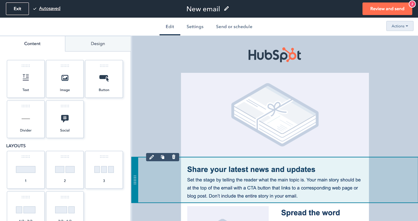 HubSpot cung cấp một công cụ tiếp thị email đáng tin cậy và có nhiều tính năng phù hợp cho các doanh nghiệp đang phát triển – miễn phí. Bạn có thể tạo các email tiếp thị chuyên nghiệp thu hút và tăng lượng khán giả của mình bằng trình tạo email kéo và thả dễ dàng. Với trình tạo email kéo và thả, bạn không cần phải đợi IT hoặc nhà thiết kế để được giúp đỡ. Thay vào đó, bạn có thể dễ dàng tạo ra những email đẹp mà khán giả của bạn sẽ yêu thích. Công cụ của HubSpot giúp bạn đạt được kết quả tiếp thị đáng kinh ngạc với ít nỗ lực.