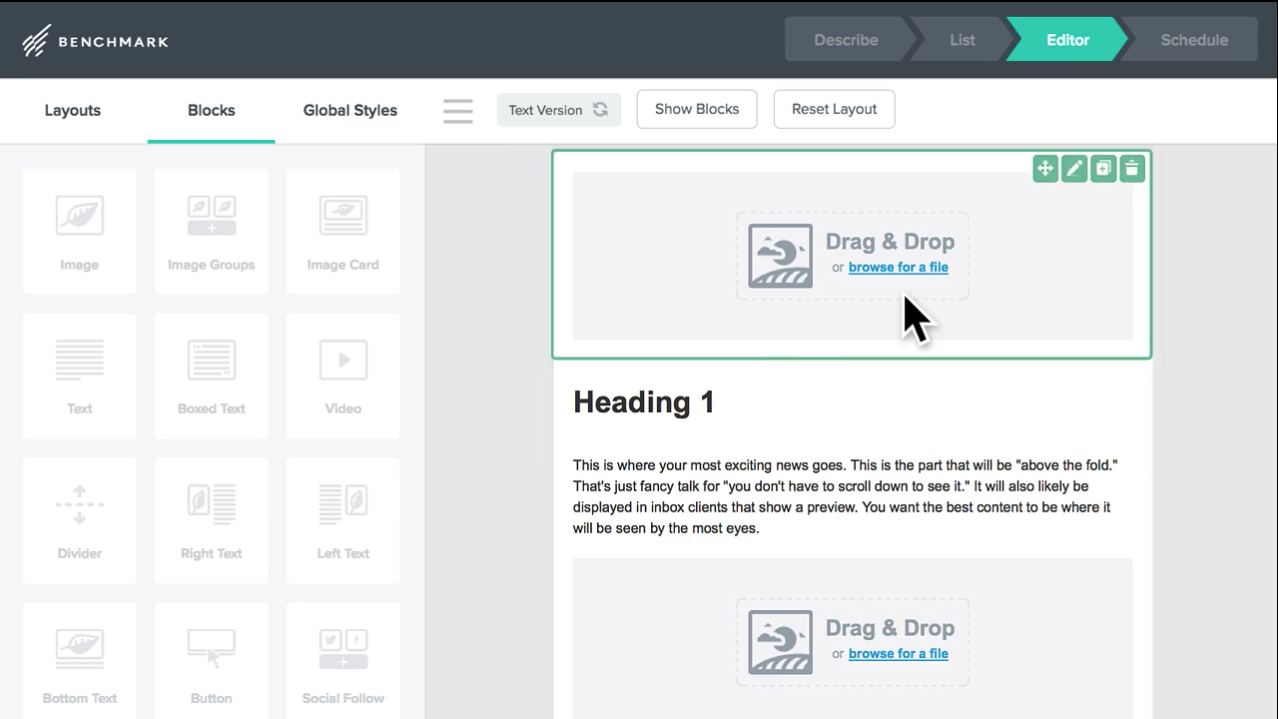 Với phiên bản miễn phí của Điểm chuẩn, bạn có thể sử dụng trình chỉnh sửa kéo và thả, chọn từ nhiều mẫu khác nhau, sử dụng biểu mẫu đăng ký, xây dựng các chiến dịch nhỏ giọt cơ bản và sử dụng tính năng vệ sinh danh sách. Điểm chuẩn thân thiện với người dùng và dễ thực hiện.
