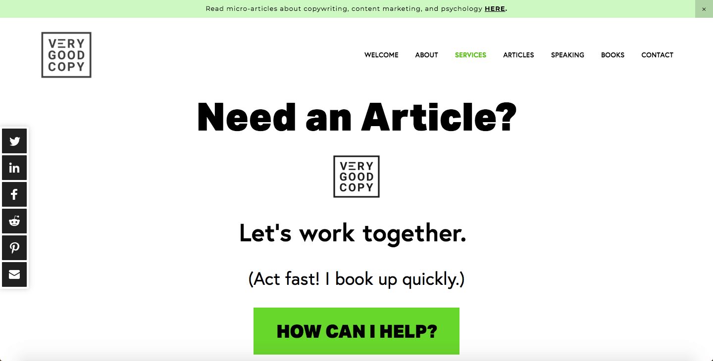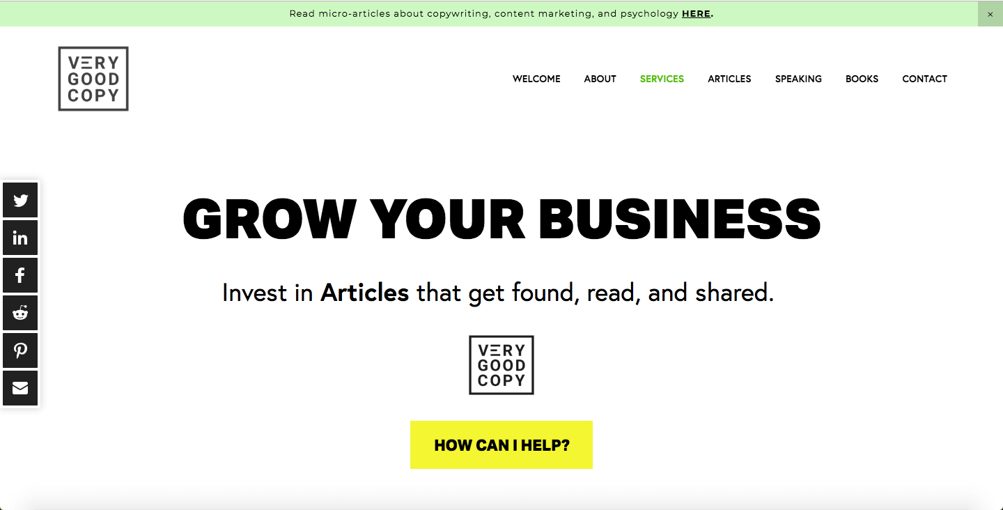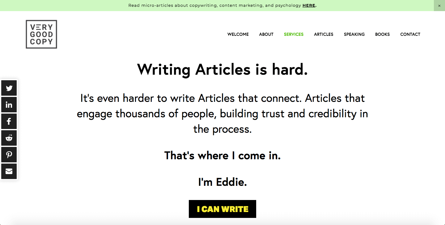 Chẳng hạn, ở đầu trang bán hàng của Eddie, hãy chú ý cách anh ấy dẫn đầu với lợi ích phát triển doanh nghiệp của bạn thay vì nói với bạn rằng anh ấy có thể viết các bài báo được tìm thấy, đọc và chia sẻ. Bằng cách cấu trúc tiêu đề của mình và phân nhóm theo cách này, anh ta có thể ngay lập tức thu hút đối tượng mục tiêu của mình, một cơ hội để đạt được khát vọng cao (phát triển kinh doanh) và hướng tới thành công (đầu tư vào bài viết của mình).