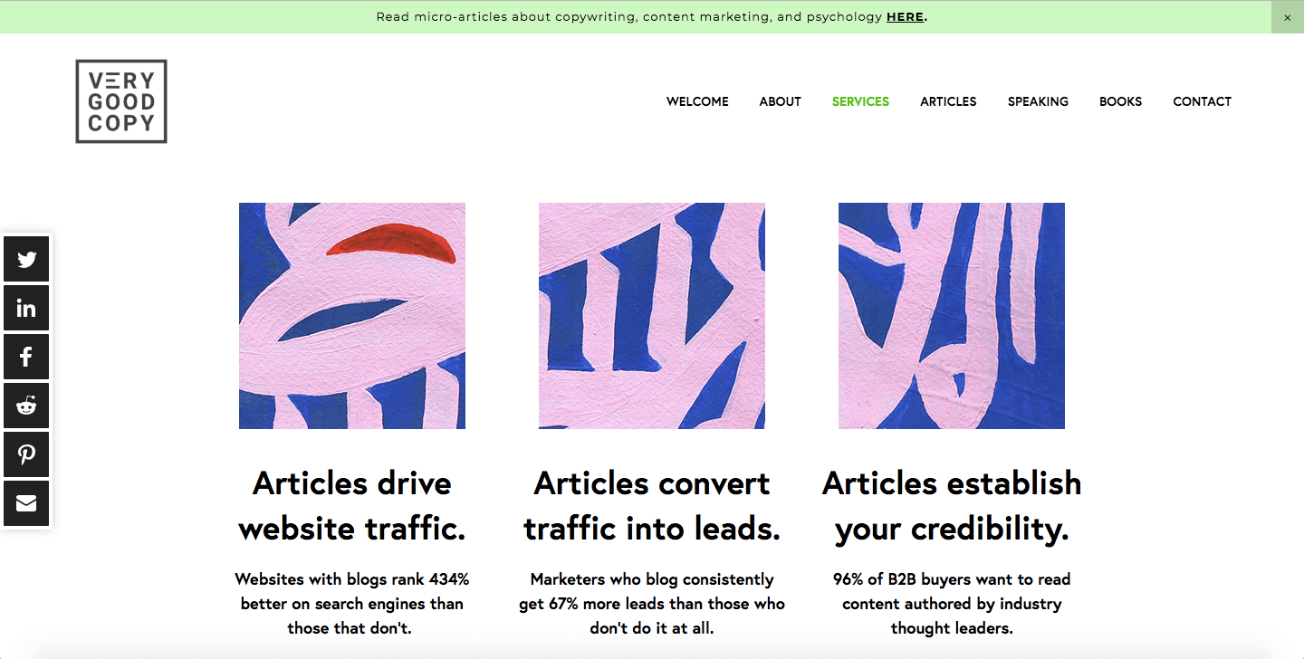 Ví dụ: trong phần tiếp theo của trang bán hàng Eddie, hãy chú ý cách anh ấy mô tả những bài viết có thể làm cho doanh nghiệp của bạn và sao lưu các khiếu nại của anh ấy với dữ liệu. Điều này củng cố uy tín dịch vụ của anh ấy và làm cho lời hứa ban đầu của anh ấy trở nên đáng tin hơn.