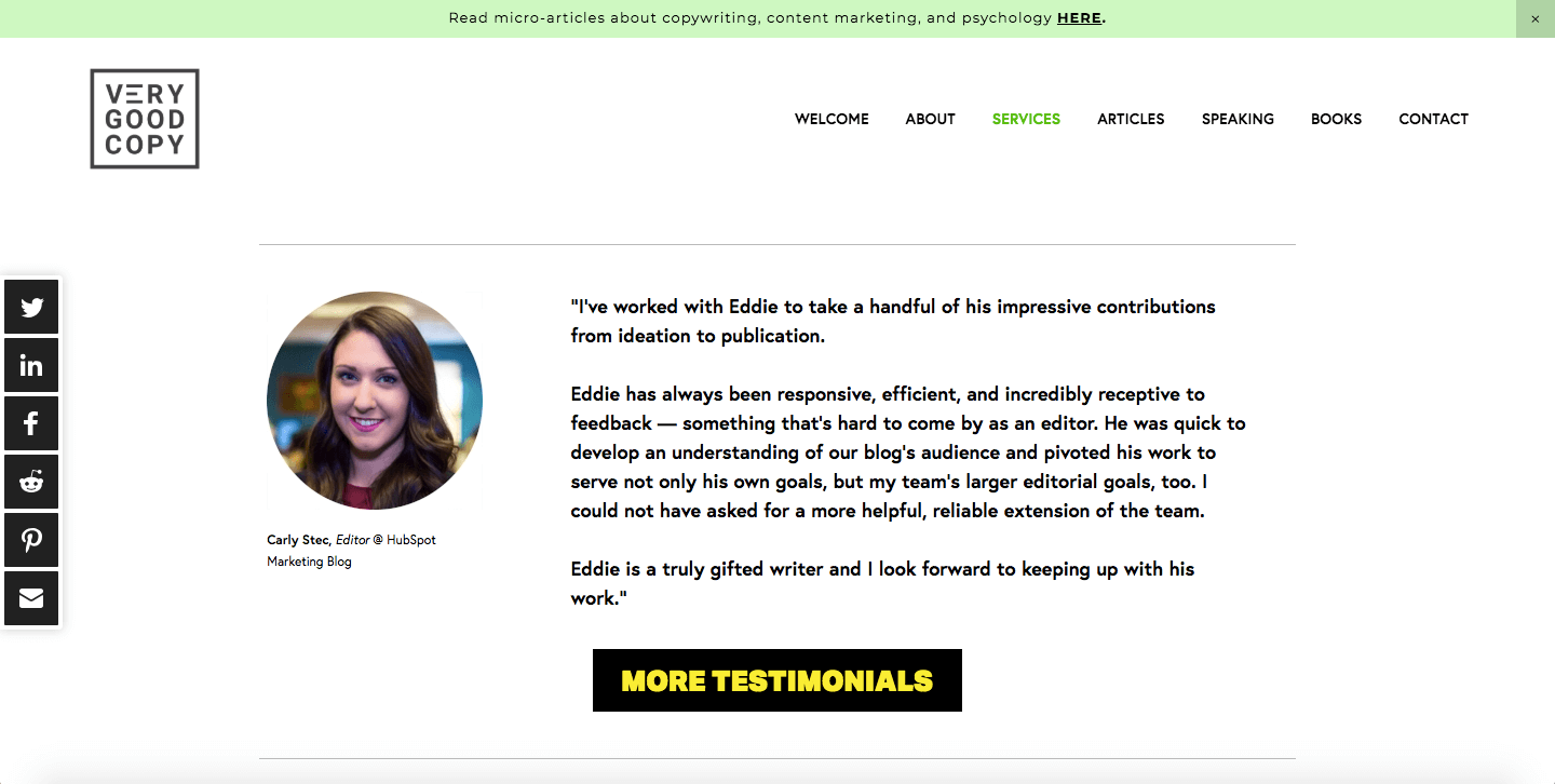 Ví dụ: vào cuối trang bán hàng của Eddie, hãy chú ý cách anh ấy bao gồm một lời chứng thực say sưa về công việc của mình tại HubSpot và liên kết đến nhiều lời chứng thực của khách hàng. Nó cung cấp bằng chứng xã hội cần thiết để thuyết phục khán giả của mình rằng anh ta là một copywriter đáng tin cậy.