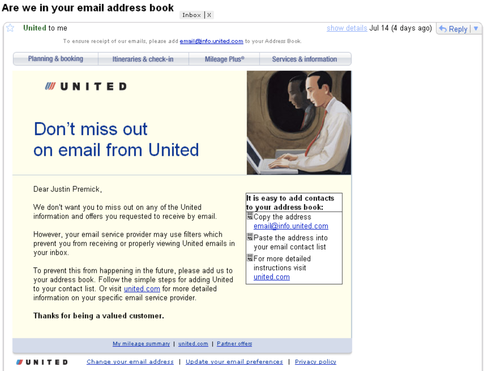 Chẳng hạn, United Airlines gửi tin nhắn sau, yêu cầu người nhận thêm United vào danh sách liên lạc của họ và giải thích lý do tại sao nó quan trọng họ làm như vậy: