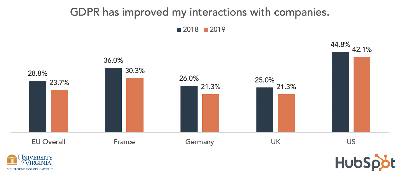 Kể từ năm 2018, số lượng E.U. và người tiêu dùng Hoa Kỳ cho rằng GDPR đã cải thiện tương tác của họ với các công ty giảm, trong đó Pháp có mức giảm lớn nhất là 6%. Trong khi Hoa Kỳ chứng kiến mức giảm dưới 2%, nhiều người tiêu dùng Mỹ báo cáo các tương tác được cải thiện trong cả năm 2018 và 2019 so với E.U. người tiêu dùng.