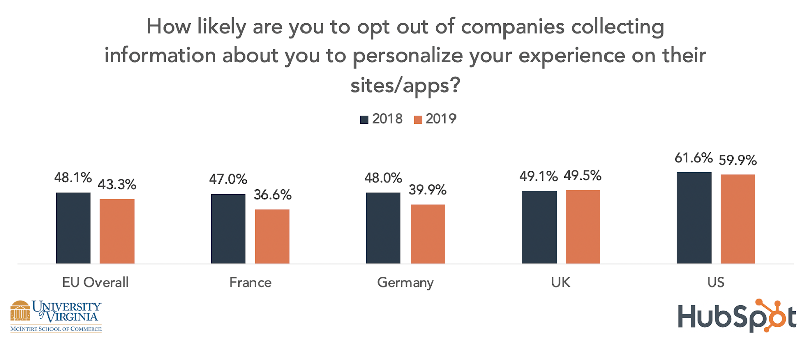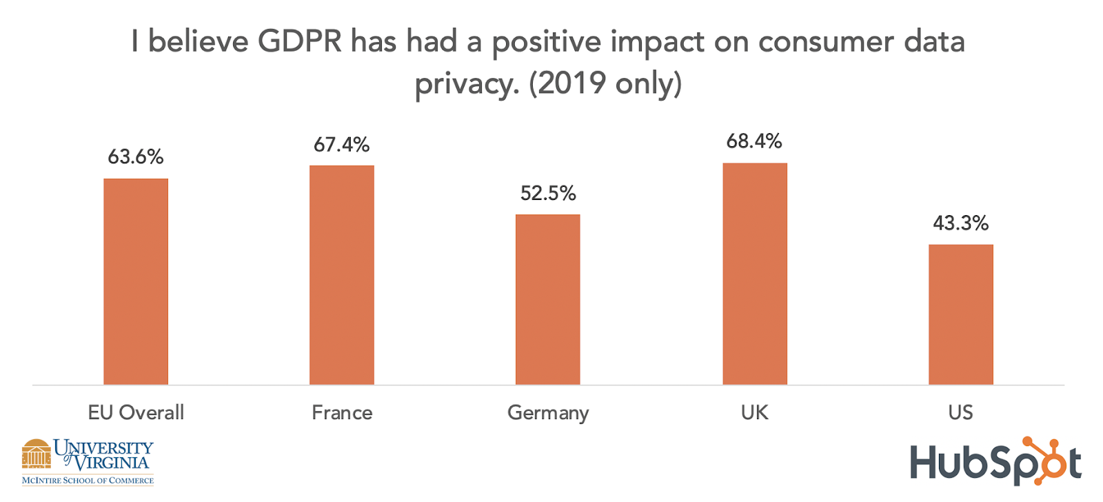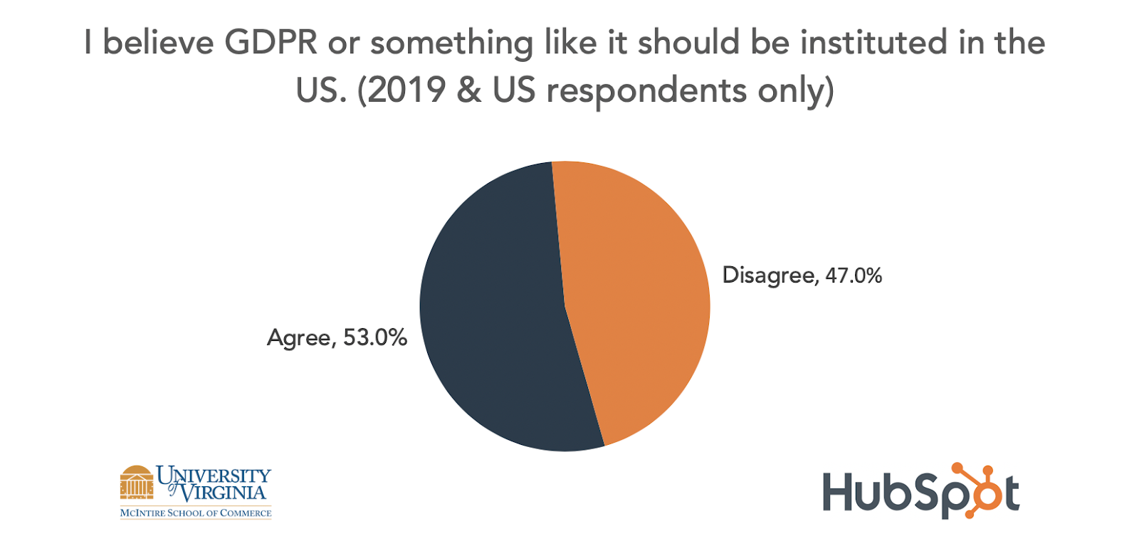 HubSpot Research đã hợp tác với Đại học Virginia để khảo sát người tiêu dùng ở Hoa Kỳ và Châu Âu vào năm 2018 và 2019. 540 người tiêu dùng ở E.U. và Hoa Kỳ đã được yêu cầu trả lời các câu hỏi khảo sát về các tổ chức thực hành sử dụng và thu thập dữ liệu và chính sách bảo mật trong năm 2018 (năm GDPR có hiệu lực).