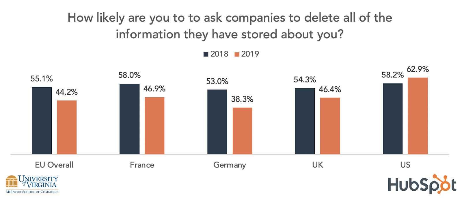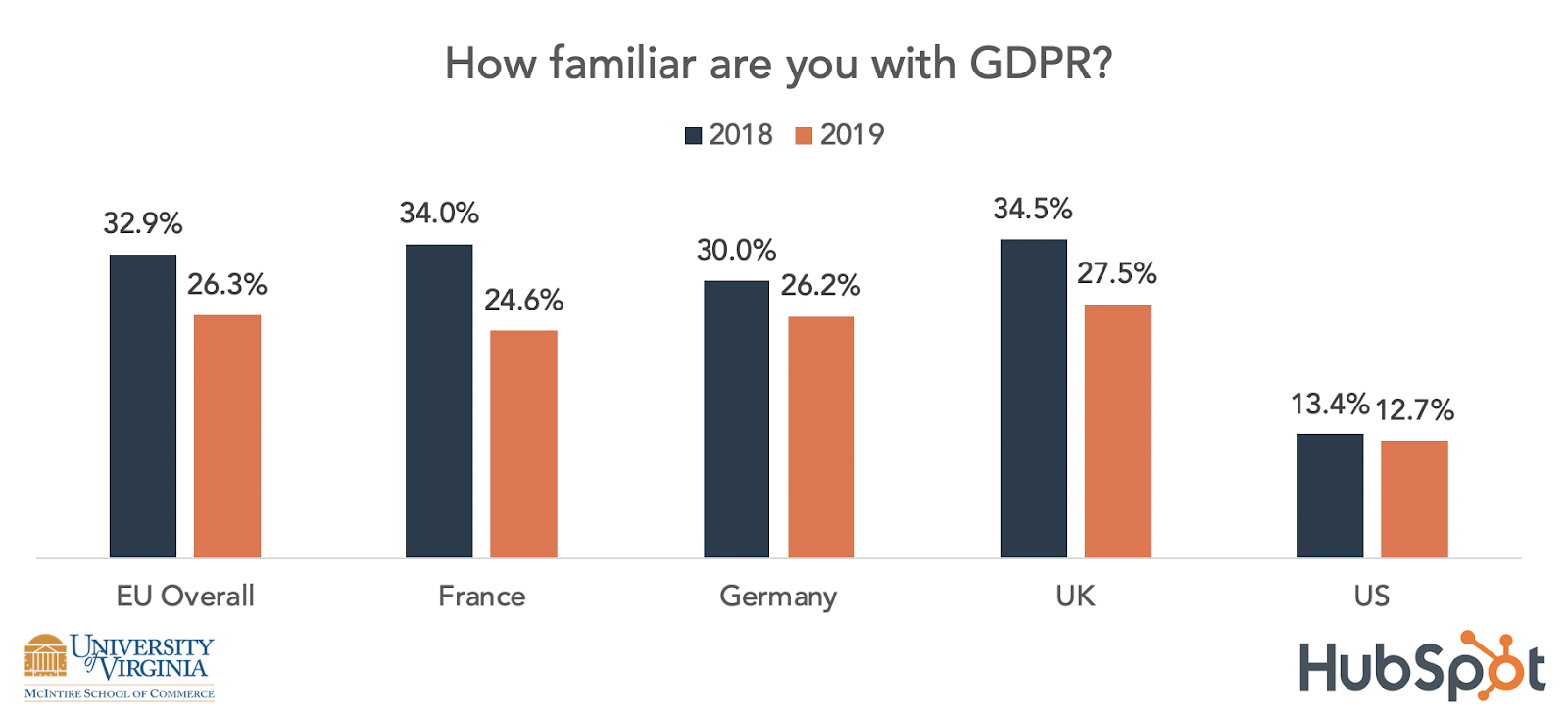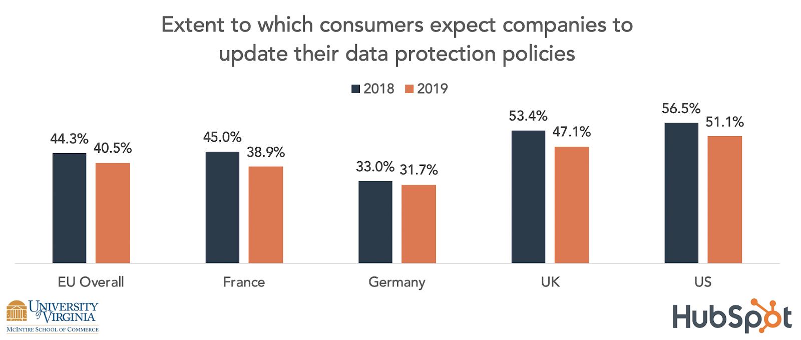 HubSpot Research đã hợp tác với Đại học Virginia để khảo sát người tiêu dùng ở Hoa Kỳ và Châu Âu vào năm 2018 và 2019. 540 người tiêu dùng ở E.U. và Hoa Kỳ đã được yêu cầu trả lời các câu hỏi khảo sát về các tổ chức thực hành sử dụng và thu thập dữ liệu và chính sách bảo mật trong năm 2018 (năm GDPR có hiệu lực).