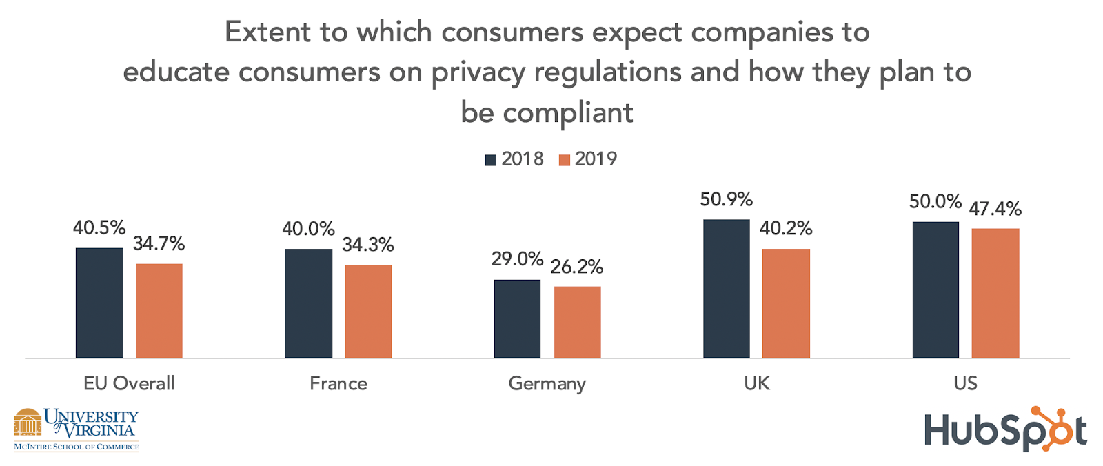 Người tiêu dùng trong E.U. và Hoa Kỳ thể hiện kỳ vọng thấp hơn khi nói đến các công ty thay đổi cách họ thể hiện, cập nhật và thậm chí thay đổi cách họ giải quyết quyền riêng tư dữ liệu. Ít hơn E.U. và người tiêu dùng Hoa Kỳ trong suốt năm ngoái mong đợi các công ty giáo dục họ về cách họ dự định tuân theo các quy định GDPR mới.