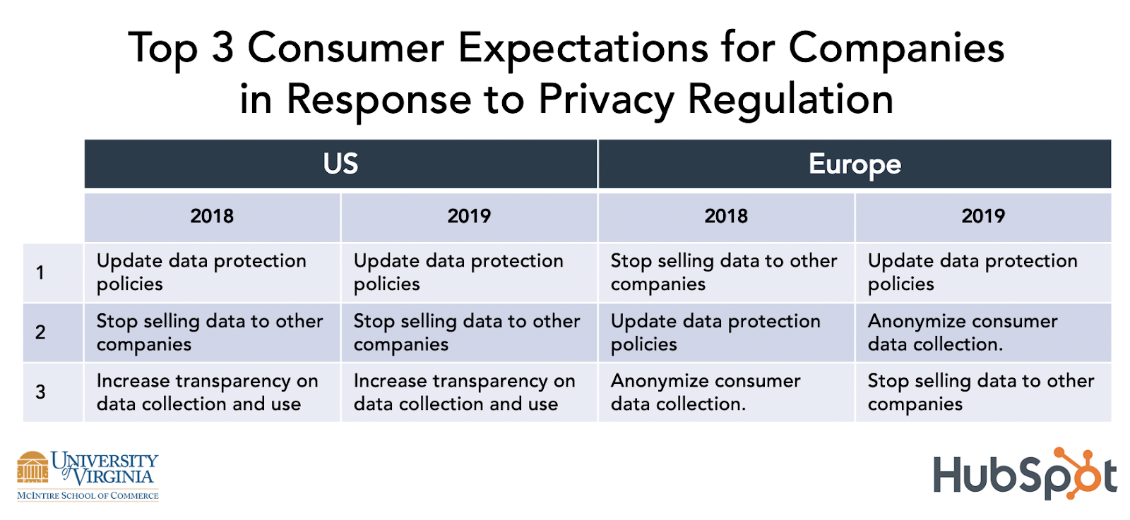 Người tiêu dùng Hoa Kỳ kỳ vọng chính về các quy định này từ 2018 đến 2019 vẫn không thay đổi – rằng các công ty sẽ cập nhật các chính sách bảo vệ dữ liệu của họ. Trong khi đó, E.U. Người tiêu dùng năm 2018 dự kiến các công ty sẽ ngừng bán dữ liệu cho các công ty khác và trong năm 2019, kỳ vọng của họ phản ánh những người tiêu dùng Hoa Kỳ.